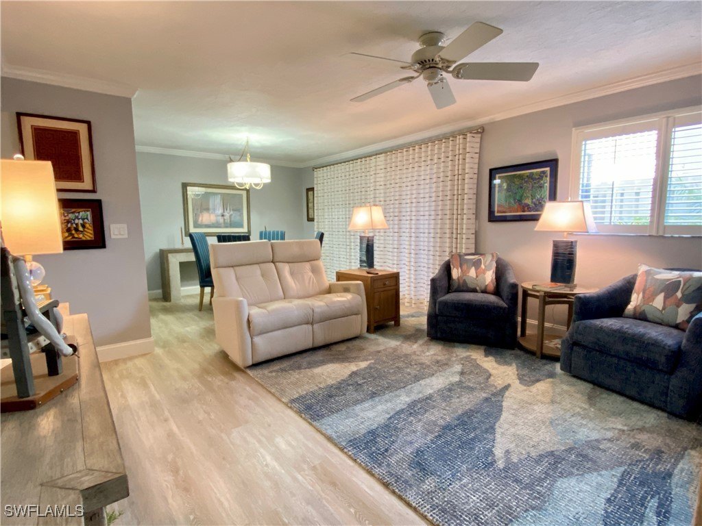 Just bring your toothbrush! This gorgeous renovated FIRST FLOOR unit in Foxmoor is being offered TURN-KEY. It has been beautifully furnished throughout. This unit has a large living room and dining room combination that opens to a lovely screened lanai. The new kitchen features navy blue base cabinets and white upper cabinets, white, new white appliances, and granite counters. There are two spacious bedrooms and two full baths. The primary bedroom has an oversized closet. Both baths have been renovated with new tile, vanities, and fixtures. Features include electric roll-down hurricane shutters, tile flooring throughout, a breakfast bar, a pantry cabinet, a new full-size washer and dryer in the unit, a screened entry door, updated lighting, ceiling fans, new AC and water heater, new neutral interior paint, new trim, and interior doors. Foxmoor is an active, pet-friendly community for all ages with GULF ACCESS to the Caloosahatchee River. This pristinely maintained community is conveniently located to US 41 & I75. There are always activities going on within Foxmoor. There is so much to offer including 3 pools, pickleball, tennis courts, bocce ball & a dock with Gulf access! Dock space is available for lease.